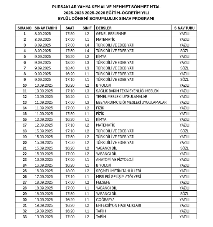 2025-2026 Eğitim-Öğretim Yılı Sorumluluk Sınav Programı